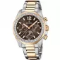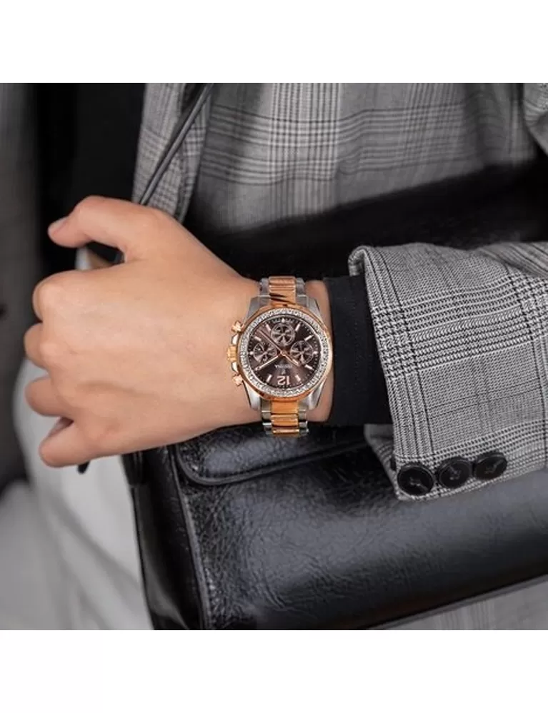Pouzdro hodinek je vyrobeno z ušlechtilé oceli, v kombinaci s PVD povrchovou úpravou v rosegold odstínu a navazuje na něj ocelový náramek, taktéž s touto povrchovou úpravou. Krásný hnědě perleťový ciferník je rámovaný zdobnými kamínky, které se zejména na sluníčku velmi pěkně třpytí. Na ciferníku se nachází celkem 3 subciferníky, které slouží pro funkci stopek, kterou hodinky disponují. Hodinky disponují vodotěsností 100 m (10 ATM), bezproblému tedy zvládnout sprchu nebo koupání.
