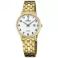Klasické dámské hodinky zlacené speciální technikou PVD. Bílý ciferník obsahuje pouze výborně čitelné arabské číslice a ručičky s tenkou luminiscenční vrstvou. Samozřejmostí je také nezbytná datumovka.
