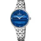 Elegantní dámské hodinky s vodotěsností 5 ATM na ocelovém tahu. Modrý číselník je ozdobený ručičkami v barvě pouzdra a čtyřmi zirkony na pozicích 3, 6 ,9 a 12 hodin.