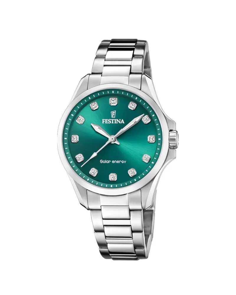 Dámské hodinky v celoocelovém provedení se zeleným číselníkem zdobeným zirkony zaujmou na první pohled. Své majitelky potěší zejména solárním napájením, díky kterému odpadá nutnost časté výměny baterie. Hodinky jsou vodotěsné do 50 metrů.