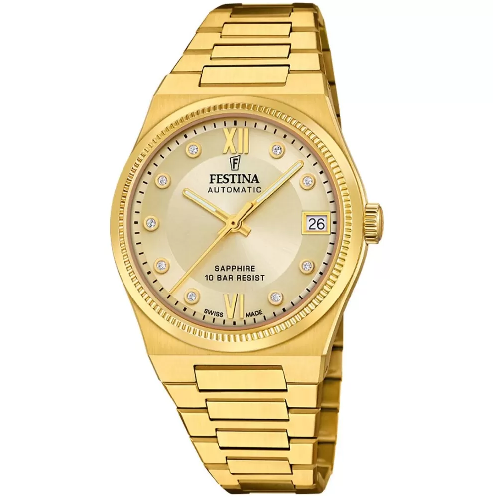 Dámský model nabídne především vysoce elegantní vzhled, který bude zdárně sekundovat i společenským šatům, safírové sklíčko odolné vůči jakémukoliv poškrábaní a voděodolnost 10 ATM, díky které zvládnou i plavání. Jednoduchá úprava číselníku s indexy je skutečná klasika. Praktickou stránku hodinek doplňuje také celoocelový tah. Pokud hledáte elegantní hodinky se švýcarským, automatickým strojkem a za skutečně dostupnou cenu, kolekce Festina Swiss Made je více než příhodnou volbou