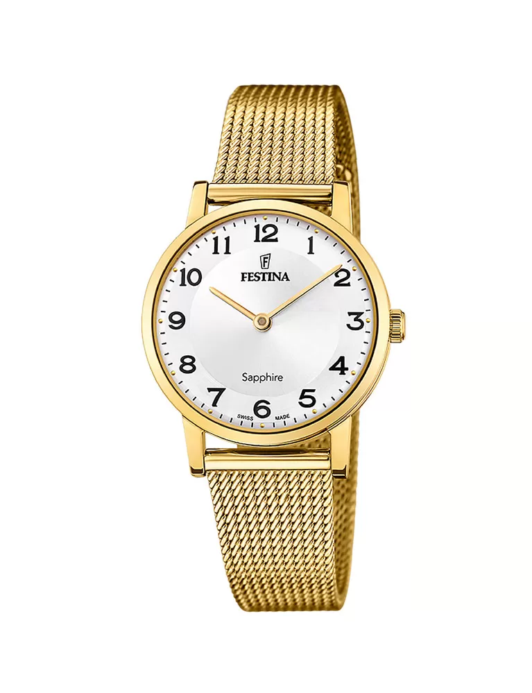 Pokud hledáte elegantní hodinky se švýcarským strojkem a za skutečně dostupnou cenu, kolekce Festina Swiss Made je více než příhodnou volbou. Festině se v ní podařilo skloubit hned několik oblíbených vlastností, kterými si vás hodinky získají. Dámský model Festina F20023 nabídne především vysoce elegantní vzhled, který bude zdárně sekundovat i společenským šatům, safírové sklíčko odolné vůči jakémukoliv poškrábaní a voděodolnost 5 ATM, díky které zvládnou běžnou vlhkost, mytí rukou a sprchu. Jednoduchá úprava číselníku s jednoduchými indexy je skutečná klasika. Praktickou stránku hodinek doplňuje také propracovaný milánský tah.