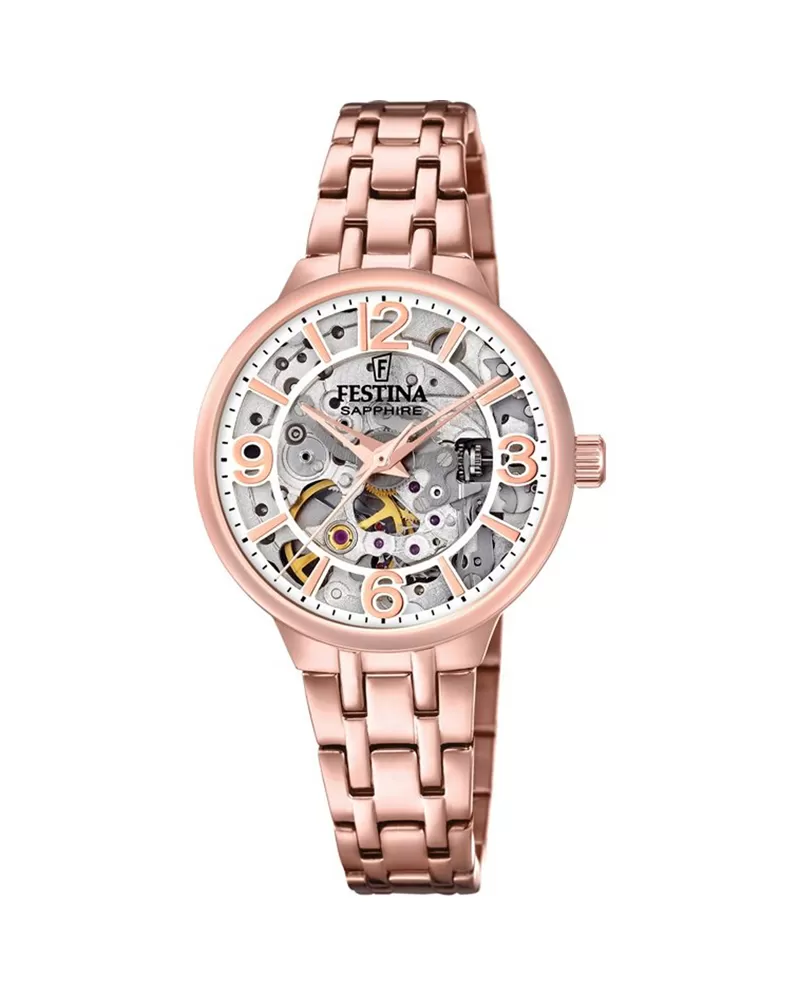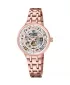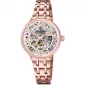 Dámské analogové hodinky s automatickým strojkem vás upoutají na první pohled. Dokonalé provedení kulatého pouzdra dá nahlédnout na pohybující se strojek, který chrání ocelové pouzdro a minerální sklo. Hodinky jsouo patřeny technikou PVD v barvě růžového zlata. Předností zlacení technologií PVD je vysoká tvrdost a odolnost proti otěru! Jedná se o silnou vrstvu, která proniká do původního materiálu. Zlacení technologií PVD se dá srovnat s přibližně 12 mikrony galvanického zlacení, což je vysoká hodnota, která při běžném nošení vydrží až 12 let. Indexy a ručičky jsou v barvě růžového zlata, které se dokonale doplňují s barvou ocele leštěné do vysokého lesku. Dopřejte si luxus a pohodlí dámských automatických hodinek. Už nebudete chtít jiné.