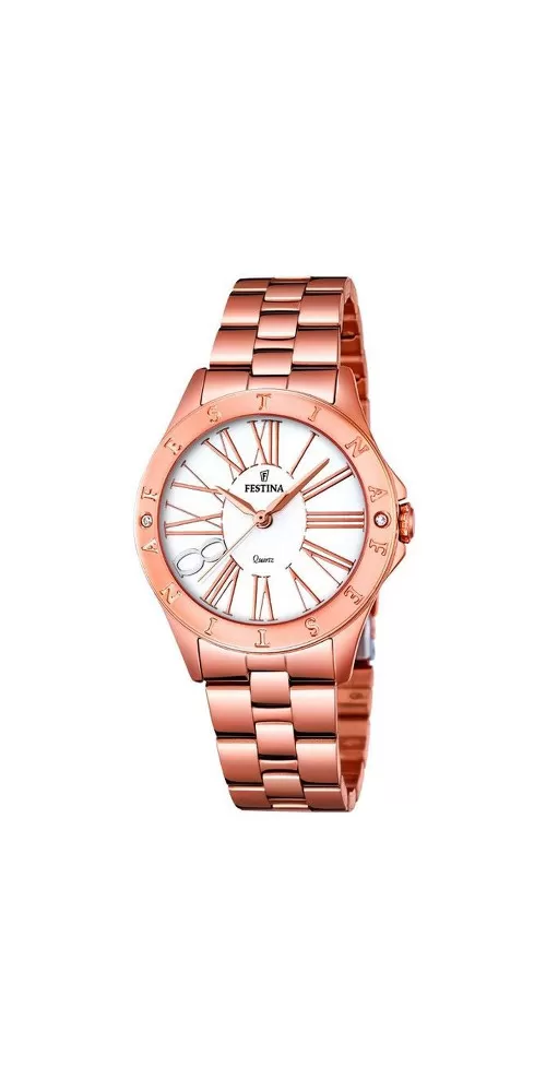 Dámské módní hodinky Festina v analogovém zobrazení času. Hodinky zaujmou na první pohled svým elegantním a originálním vzhledem. Hodinky mají ocelový řemínek s PVD povlakem v bronzové barvě a ciferník kulatého tvaru v bílé barvě. Pouzdro je krásně zdobené zářivými kamínky. Švýcarská značka hodinek FESTINA vyniká svým moderním designem a prvotřídní kvalitou. A to všechno za velice příznivou cenu.