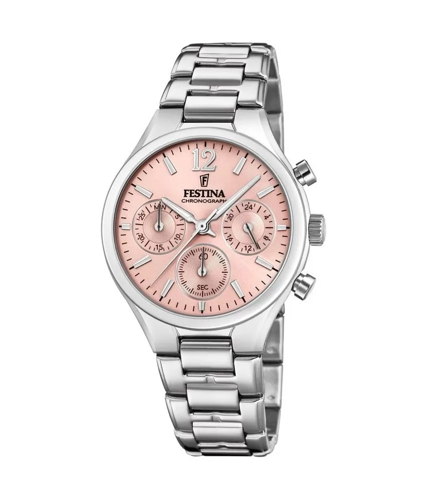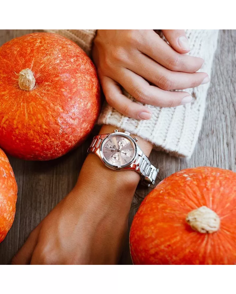 Dámské náramkové hodinky vyrobené z nerezové oceli s růžovým ciferníkem můžete nosit jak v běžný den, tak do společnosti. Růžový ciferník je zdobený třemi sub-ciferníky s funkcí stopek a 24 hodinovým formátem času. Hodinky jsou pod označením 50M vodotěsné až do hloubky 0,5 metrů.