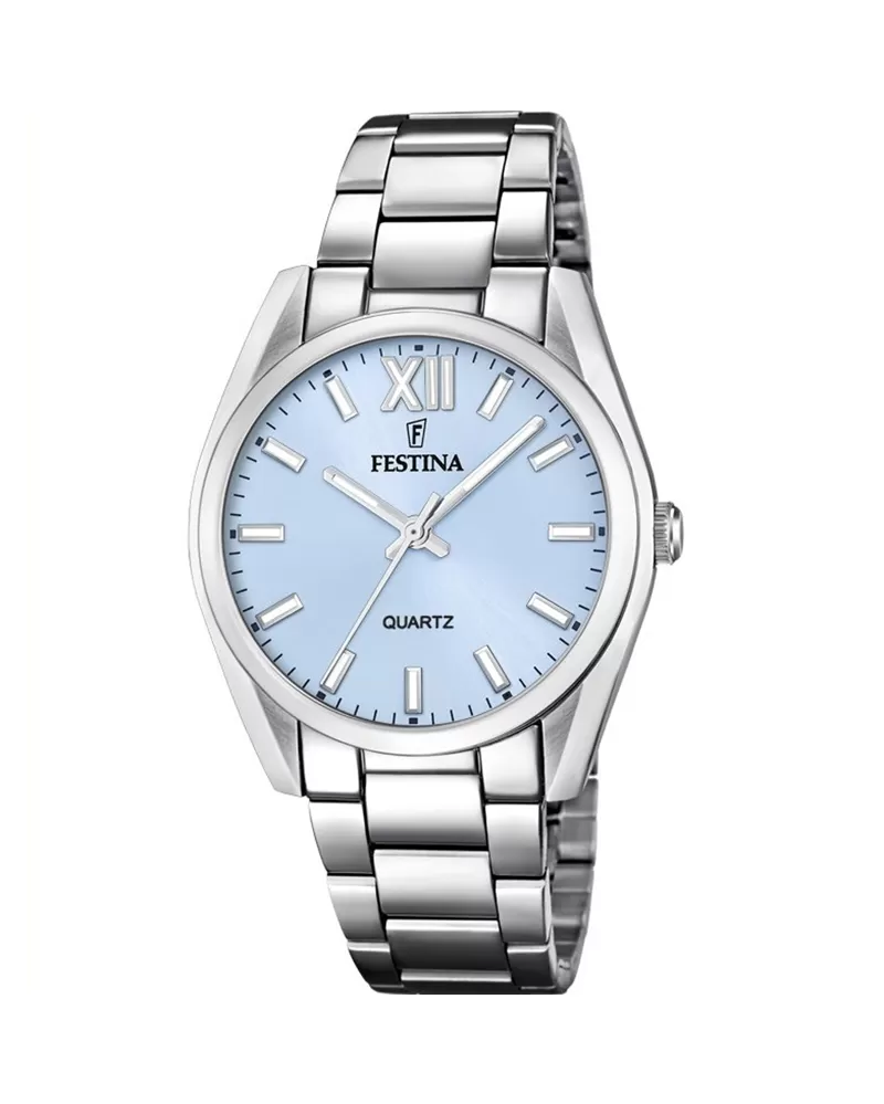 Klasické hodinky Festina jsou vyrobeny z chirurgické ocele, která je známá svými skvělými vlastnostmi. Ocel je velmi pevná, houževnatá a antialergická. Tento model dámských hodinek potěší ženy co si nepotrpí na výstřední doplňky a hledají hlavně praktičnost a eleganci. Hodinky mají kulaté pouzdro s modrým ciferníkem a hladkými indexy hodin. Indexy hodin i ručičky mají luminiscenční vrstvu, která poslouží při sledování času v noci. Hodinky se zapínají na překlápěcí sponu.