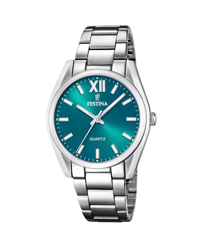 Klasické hodinky Festina jsou vyrobeny z chirurgické ocele, která je známá svými skvělými vlastnostmi. Ocel je velmi pevná, houževnatá a antialergická. Tento model dámských hodinek potěší ženy co si nepotrpí na výstřední doplňky a hledají hlavně praktičnost a eleganci. Hodinky mají kulaté pouzdro s modrým ciferníkem a hladkými indexy hodin. Indexy hodin i ručičky mají luminiscenční vrstvu, která poslouží při sledování času v noci. Hodinky se zapínají na překlápěcí sponu.