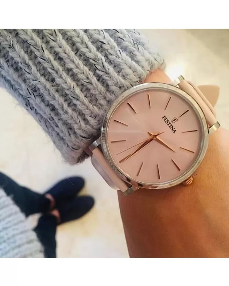 Toužíte po elegantních hodinkách, které zaujmou vaše okolí a ve kterých se budete cítit příjemně i po celodenním nošení? Tyto krásné hodinky značky Festina jsou vyrobené v kombinaci ocelového pouzdra a koženého řemínku růžové barvy. Kůže Vám nebude tížit ruku a bude pohodlným řemínkem na celý den. Hodinky jsou laděné do růžové barvy společně se zlacenými indexy a ručičkami červeným zlatem. Vodotěsnost tohoto modelu se vztahuje pouze na lehký déšť nebo mytí rukou.