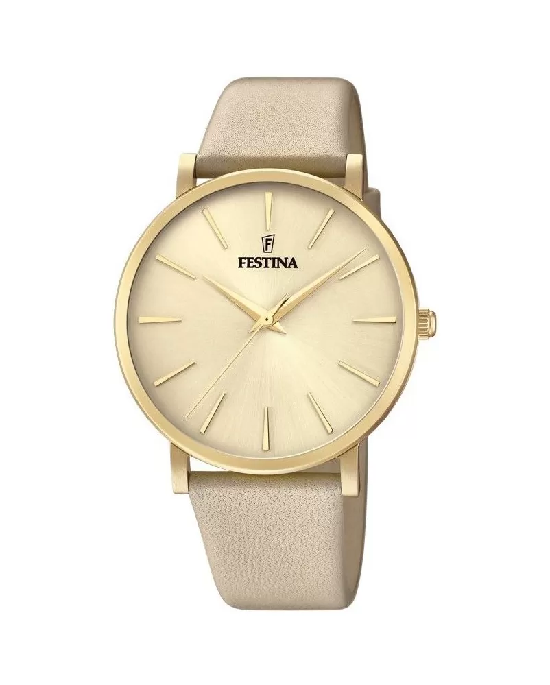 Toužíte po elegantních hodinkách, které zaujmou vaše okolí a ve kterých se budete cítit příjemně i po celodenním nošení? Tyto krásné hodinky značky Festina jsou vyrobené v kombinaci ocelového pouzdra a koženého řemínku zlaté barvy. Kůže vám nebude tížit ruku a bude pohodlným řemínkem na celý den. Hodinky jsou celé laděné do zlaté barvy. Vodotěsnost tohoto modelu se vztahuje pouze na lehký déšť nebo mytí rukou.