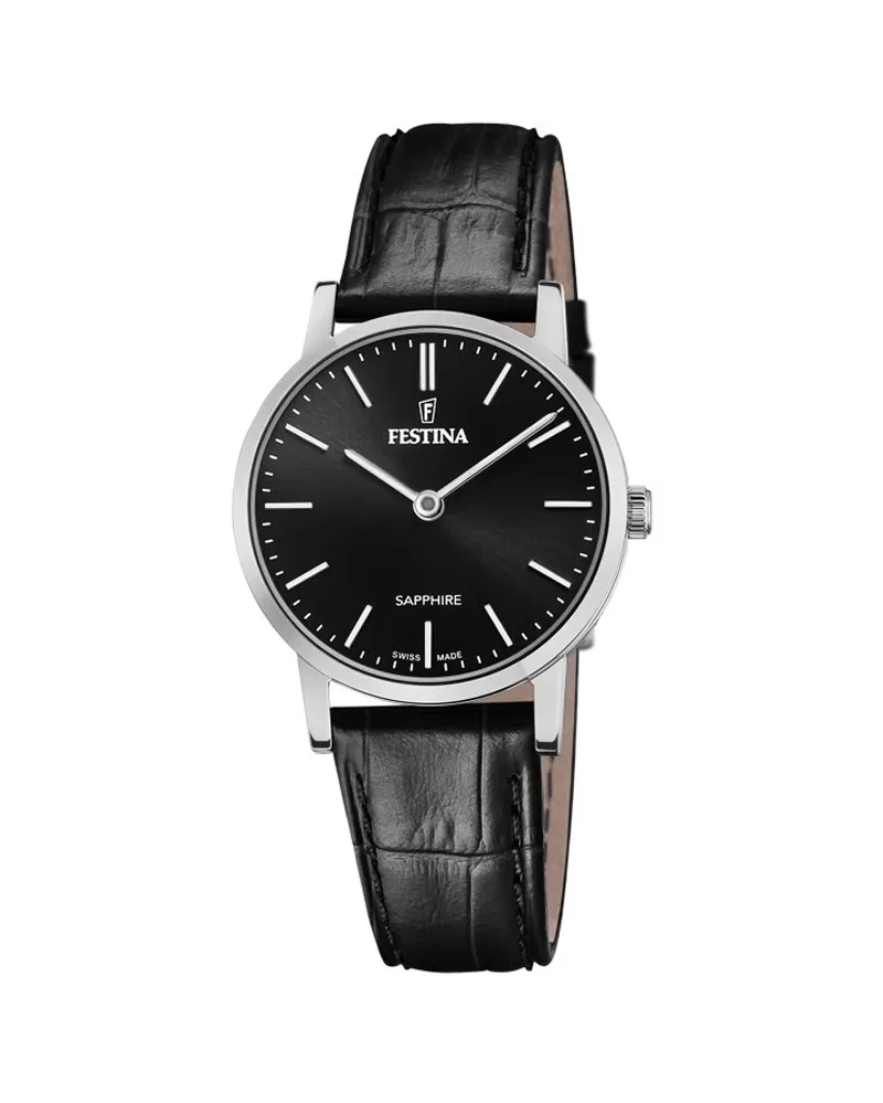 Černá elegance dámských hodinek Festina 20013/4 s koženým pouzdrem a safírovým sklíčkem. Hodinky z kolekce Swiss made jsou exkluzivní kolekci nadčasových hodinek, které ztělesňuji podstatu, prestiž a know-how Švýčarských hodinek. Hodínky nabízí vysoce elagatní vzhled. Dále hodinky mají safírové sklíčko, proti poškrábání. Hodinky mají švýcarský quartzový strojek Ronda 704.