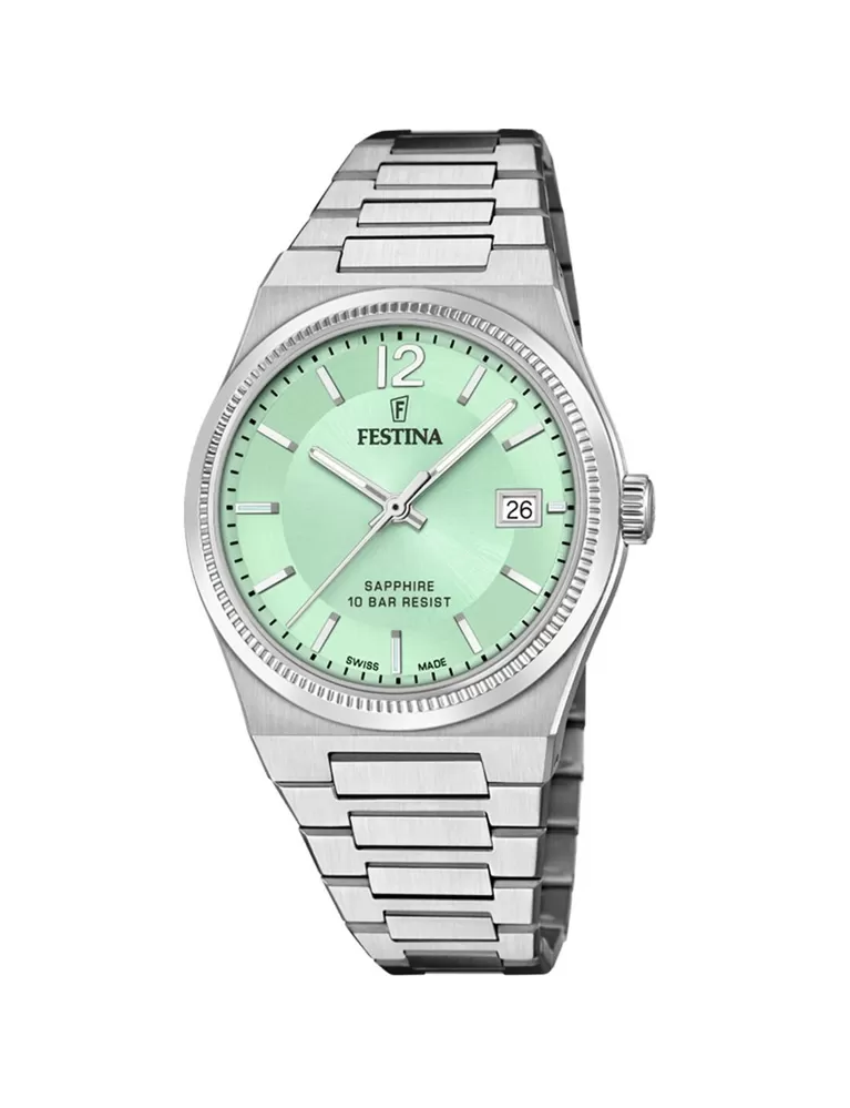 Značka Festina se pyšní více než stoletou tradicí na světovém trhu, která začíná roku 1902 v jedné švýcarské hodinářské manufaktuře v městečku La Chaux de Fonds. Věnovala se výrobě mechanických hodinek a to do roku 1984, kdy značku převzal Miguel Rodriquez a začal i se stojky quartzovými. Nyní je značka Festina součástí skupiny Festina Group se sídlem v Barceloně a s výrobními centry ve Švýcarsku, Španělsku a Asii. Své hodinky dodává do hodinářství po celém světě. Do povědomí zákazníků se zapsala především modelovou řadou Tour de France. Festina Vám však může nabídnout celé spektrum dámských i pánských modelů od sportovních, jako je řada Tour de France, tak i elegantní kolekce jako je Mademoiselle. Hodinky značky FESTINA nikdy nezaměníte s jinou značkou. Jsou originální, nápadité a budou zároveň i dokonalým šperkem. Švýcarská značka hodinek FESTINA vyniká svým moderním designem a prvotřídní kvalitou. A to všechno za velice příznivou cenJednoduchá úprava číselníku s indexy je skutečná klasika. Praktickou stránku hodinek doplňuje také celoocelový tah.