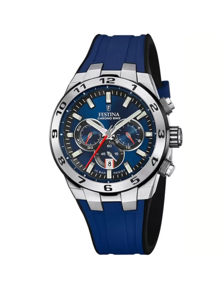 Hodinky Festina Chrono Bike skvěle kombinují sportovní a elegantní vzhled. Díky tomuto sladění je možné hodinky využít prakticky při každé příležitosti. Hodinky Festina Chrono Bike 20671/1 jsou vyrobeny z ušlechtilé oceli a s pryžovým řemínkem v různých barevných provedeních. Ciferník je chráněn minerálním sklíčkem. Na ciferníku se nachází stopky (chronograf), datumovka a 24hodinový ciferník. Vodotěsnost činí 100 metrů (10 ATM), bez problémů s nimi tedy můžete i do bazénu.