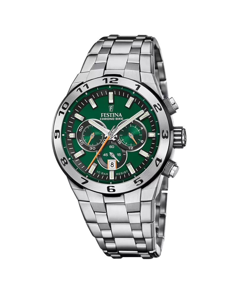 Výrazné barvy odkazující na cyklistické dresy silniční cyklistiky a sexy detaily připomínající cyklistické prvky. Jsou krásné a nové. Nové barvy, nový číselník i luneta. Nový nádech, navíc s něčím opravdu výjimečným. Hodinky Festina Chrono Bike skvěle kombinují sportovní a elegantní vzhled. Díky tomuto sladění je možné hodinky využít prakticky při každé příležitosti. Hodinky Festina Chrono Bike 20670/2 jsou vyrobeny v celoocelovém zpracování. Na ciferníku chráněném minerálním sklíčkem se nachází stopky (chronograf), datumovka a 24hodinový ciferník. Vodotěsnost činí 100 metrů (10 ATM), bez problémů s nimi tedy můžete i do bazénu.
