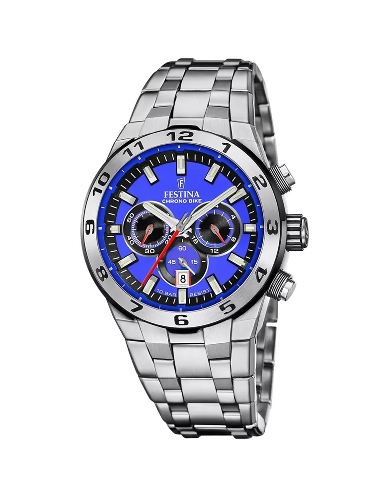 Výrazné barvy odkazující na cyklistické dresy silniční cyklistiky a sexy detaily připomínající cyklistické prvky. Jsou krásné a nové. Nové barvy, nový číselník i luneta. Nový nádech, navíc s něčím opravdu výjimečným. Hodinky Festina Chrono Bike  skvěle kombinují sportovní a elegantní vzhled. Díky tomuto sladění je možné hodinky využít prakticky při každé příležitosti. Hodinky Festina Chrono Bike 20670/3 jsou vyrobeny v celoocelovém zpracování. Na ciferníku chráněném minerálním sklíčkem se nachází stopky (chronograf), datumovka a 24hodinový ciferník. Vodotěsnost činí 100 metrů (10 ATM), bez problémů s nimi tedy můžete i do bazénu.