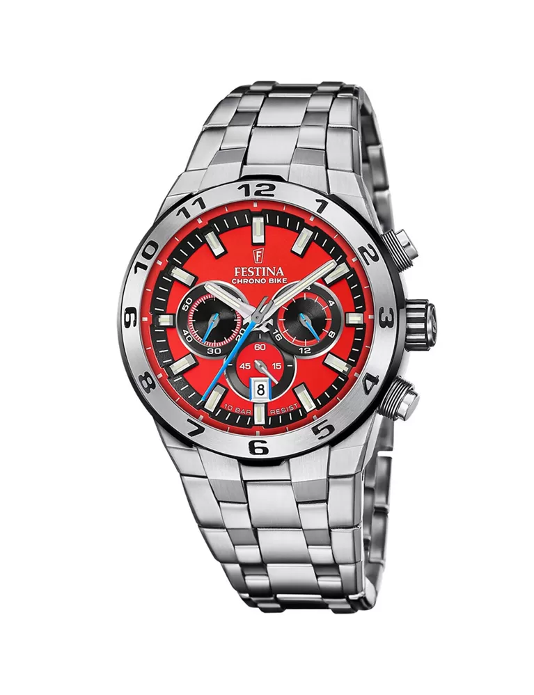 Výrazné barvy odkazující na cyklistické dresy silniční cyklistiky a sexy detaily připomínající cyklistické prvky. Jsou krásné a nové. Nové barvy, nový číselník i luneta. Nový nádech, navíc s něčím opravdu výjimečným. Hodinky Festina Chrono Bike  skvěle kombinují sportovní a elegantní vzhled. Díky tomuto sladění je možné hodinky využít prakticky při každé příležitosti. Hodinky Festina Chrono Bike 20670/5 jsou vyrobeny v celoocelovém zpracování. Na ciferníku chráněném minerálním sklíčkem se nachází stopky (chronograf), datumovka a 24hodinový ciferník. Vodotěsnost činí 100 metrů (10 ATM), bez problémů s nimi tedy můžete i do bazénu.