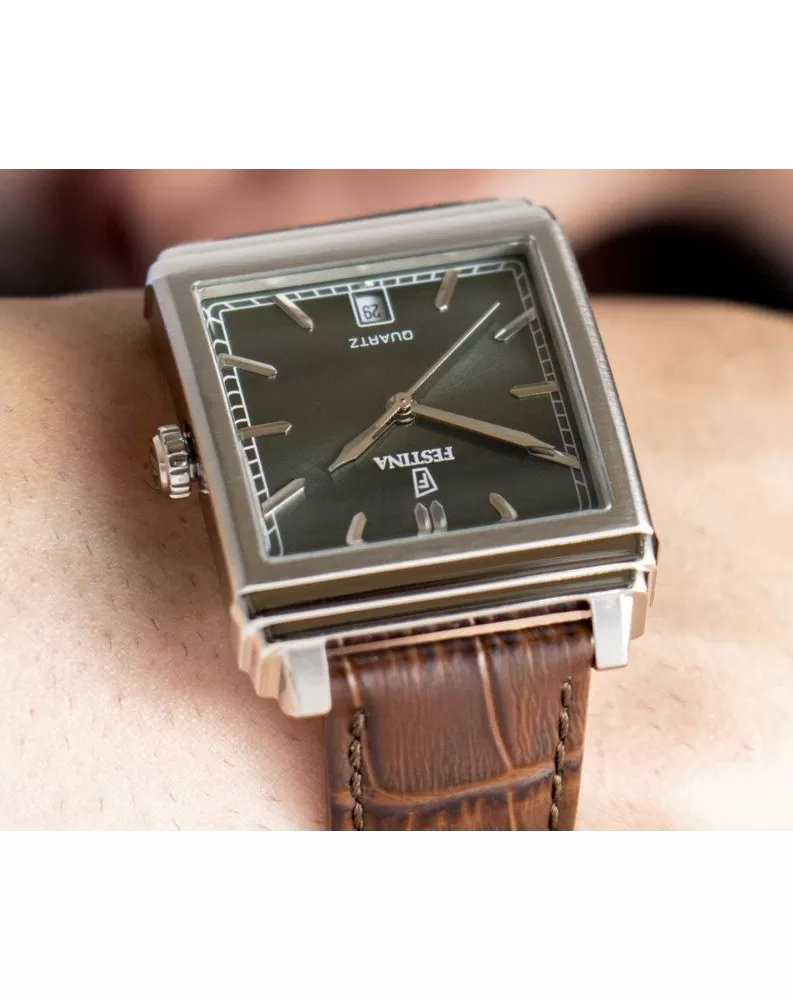 Pánské hodinky Festina jsou moderním modelem vyznačujícím se jednoduchým a elegantním provedením. Pánský model Festina nabídne především vysoce elegantní vzhled, který bude zdárně sekundovat i společenskému obleku, minerální sklíčko a voděodolnost 5 ATM, s níž hodinky zvládnou i mytí rukou. Na pozici 6. hodiny se nachází jednoduchý ukazatel data.