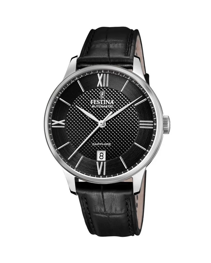 Hledáte pohodlné automatické hodinky? To vás potěší tyto hodinky s kruhovým ocelovým pouzdrem, který skrývá mechanický strojek na automatický nátah, pohyb ruky při běžném nošení tedy zajistí neustále dotahování hodinek. Přehledný ciferník obsahuje zvýrazněné indexy hodin a římské číslice stříbrnou barvou ve které jsou i ručičky hodin. Ciferník má také k dispozici datum, který je umístěn na pozici šesti hodin. Celý model doplňuje kožený řemínek v černé barvě s krokodýlím vzorem.