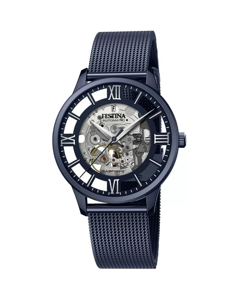 Pánský skeletonový model AUTOMATIC 20574/1 oblíbené značky FESTINA pro muže. Odvážná průsvitná konstrukce spolu s milánským náramkem v modré barvě s PVD povlakem.