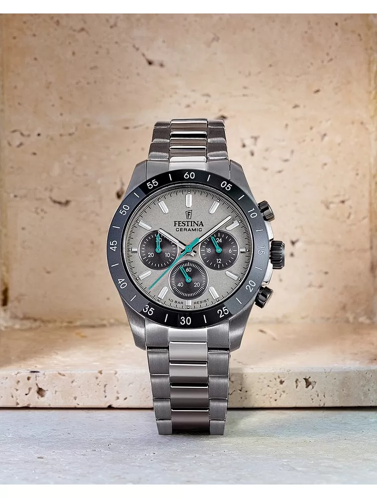 Kolekce Ceramic od Festiny je na vysoké úrovni díky kombinaci ušlechtilé oceli a odolné keramiky, která se nepoškrábe. Tyto hodinky nejsou jen praktickým doplňkem, ale i módním kouskem, který zaujme. Kolekce se zaměřuje na modrou, černou, bílou a stříbrnou barvu, doplněnou o prvky růžového zlata. Pánové ocení sportovnější variantu chronografů s ocelovým pouzdrem a keramickou lunetou na ocelovém nebo kaučukovém řemínku. Tato kolekce je zárukou spokojenosti a stylu.