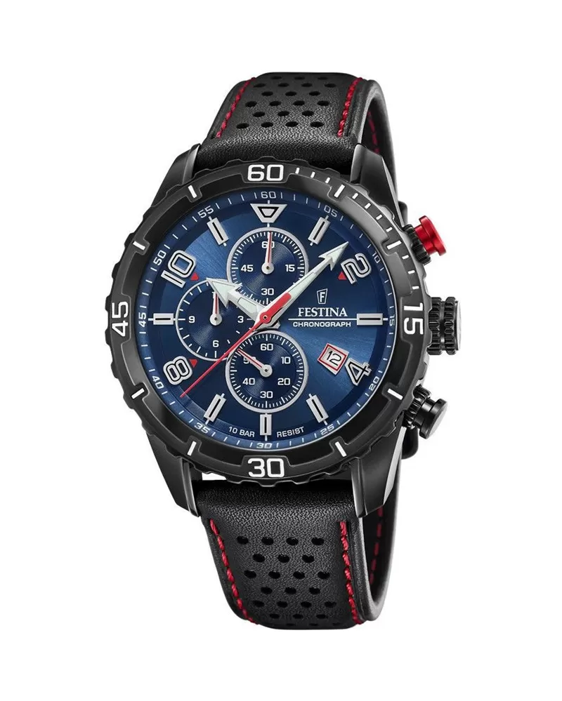 I sportovci si potrpí na design a právě pro ně tu je tento nový model, který nepřehlédnete. Hodinky mají kulaté ocelové pouzdro potažené PVD černou povrchovou úpravou. Pouzdro zdobí funkční luneta a desingově vyladěná korunka a tlačítka pro ovládání chronografu. Ciferník chrání minerální sklo a může se pyšnit třemi ciferníky a datumem, který je na pozici čtyř hodin. Pro dokonalé pohodlí je řemínek z luxusní kůže.