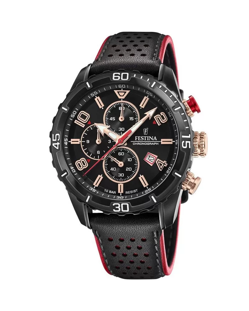 I sportovci si potrpí na design a právě pro ně tu je tento nový model, který nepřehlédnete. Hodinky mají kulaté ocelové pouzdro potažené PVD černou povrchovou úpravou. Pouzdro zdobí funkční luneta a desingově vyladěná korunka a tlačítka pro ovládání chronografu. Ciferník chrání minerální sklo a může se pyšnit třemi ciferníky a datumem, který je na pozici čtyř hodin. Pro dokonalé pohodlí je řemínek z luxusní kůže.