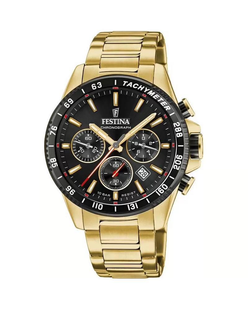 Masivní sportovní hodinky Festina zaujmou zpracováním, výrazným pouzdrem a zlacením v barvě žlutého zlata.