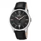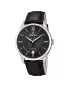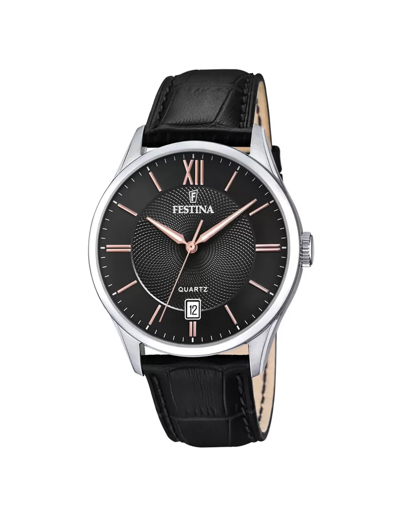 Pánské quartzové hodinky v elegantním designu s ocelovým pouzdrem a koženým řemínkem. Na černém číselníku, který je chráněn minerálním sklem, vynikají kontrastní ručičky a indexy v barvě růžového zlata. Hodinky disponují funkcí ukazatele data.