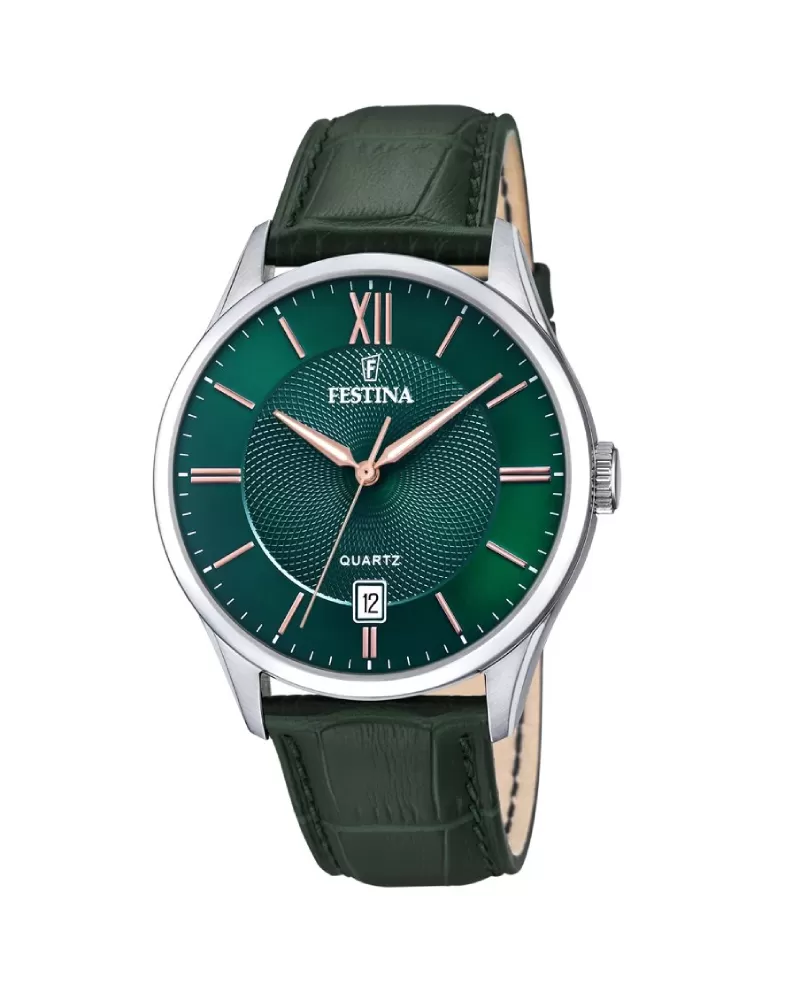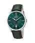 Pánské quartzové hodinky v elegantním designu s ocelovým pouzdrem a koženým řemínkem. Na smaragdově zeleném číselníku, který je chráněn minerálním sklem, vynikají kontrastní ručičky a indexy v barvě růžového zlata. Hodinky disponují funkcí ukazatele data.