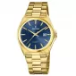 Pánské quartzové hodinky na ocelovém tahu s částečnou PVD úpravou zlaté barvy, která jemně kontrastuje s modrým číselníkem. Vodotěsnost dosahující 50 metrů umožňuje plavání.