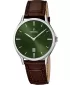 Pánské quartzové hodinky v elegantním designu s ocelovým pouzdrem a hnědým koženým řemínkem. Na zeleném číselníku, který je chráněn minerálním sklem, vynikají kontrastní ručičky a indexy. Hodinky disponují funkcí ukazatele data.