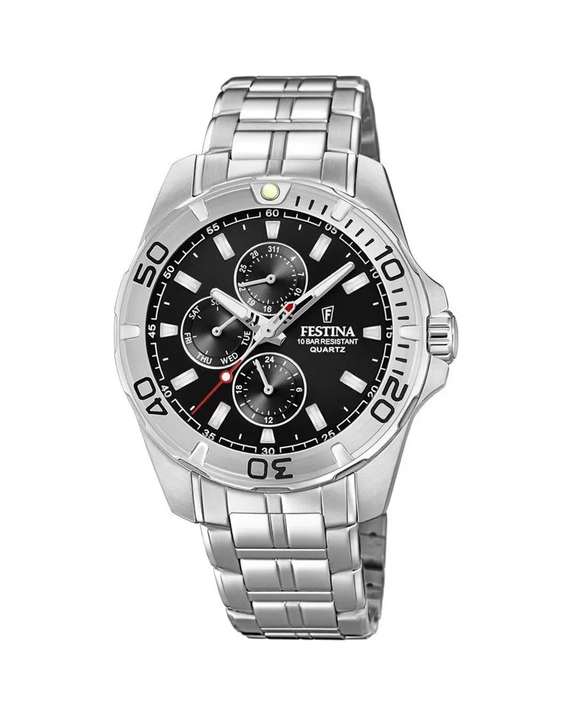Multifunkční model značky Festina je určen pro sportovce, kteří hledají odolný kousek do své sbírky. Hodinky jsou celé vyrobené z nerezové oceli, která se pyšní vysokou odolností a dlouhou životností. Pod označením 100M jsou hodinky vodotěsné až do hloubky 8 metrů. Ciferník je chráněn minerálním sklíčkem a disponuje jednoduchými indexy hodin. Ručičky i indexy jsou potaženy luminiscenční vrstvou pro lepší viditelnost v tmavé místnosti. Sub-ciferníky hodinek disponují ukazateli data, dne v týdnu.