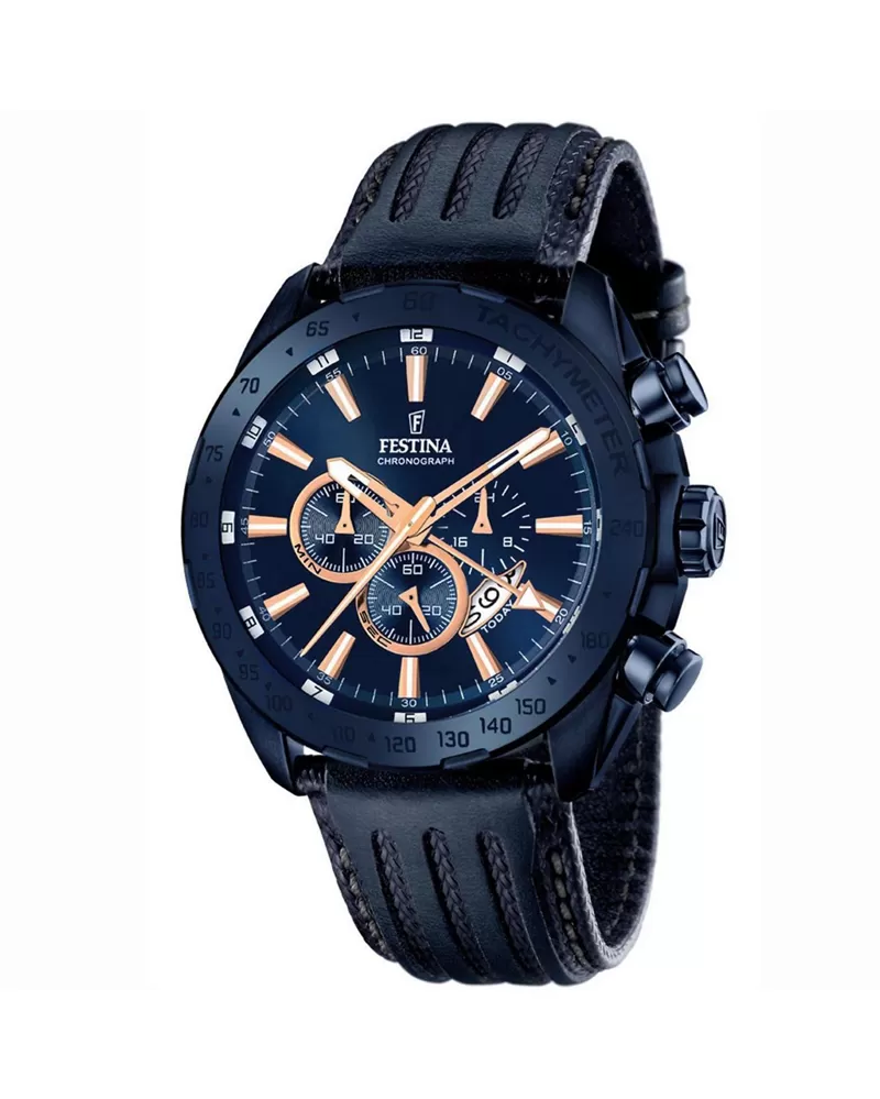 Luxusní model z kolekce CHRONO 16898/1 oblíbené značky FESTINA pro muže. Hodinky budou vkusným doplňkem ke sportování, tak i do společnosti. Hodinky mají řemínek z pravé kůže v modré barvě. Ciferník je také v modré barvě a dále hodinky disponují stopkami, tachymetrem, ukazatelem data a 24 hodinovým ciferníkem.