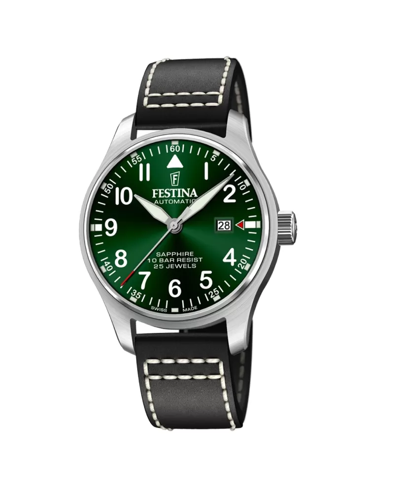 Pilotní hodinky s vodotěsností 10 ATM se safírovým sklíčkem. Ocelové pouzdro s koženým řemínkem s kontrastním prošíváním. Chod hodinek zajišťuje automatický strojek ETA 2824 s funkcí ukazatele data a rezervou chodu 48 hodin.