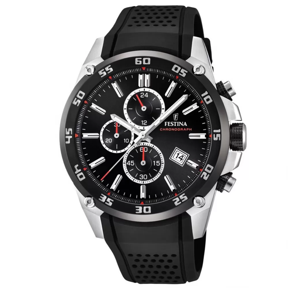 Sportovní model z kolekce Chronograph 20330/5 oblíbené značky FESTINA pro muže. Hodinky budou vkusným doplňkem do společnosti, na každodenní nošení i na sportování. Hodinky mají ocelové pouzdro a kaučukový černý řemínek. Černý ciferník disponuje třemi subciferníky zobrazující stopky a 24 hodinový ciferník. Nechybí ani nezbytná datumovka.