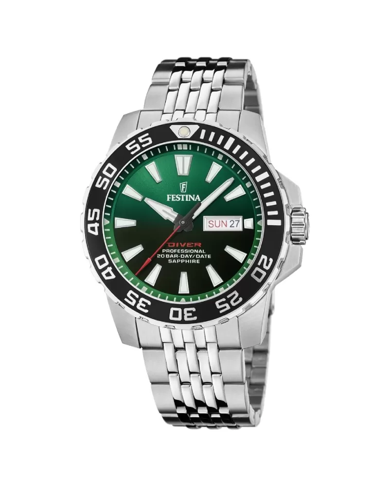 Pánské quartzové hodinky, které mají datumovku s dnem v týdnu. Vodotěsnost je 20 ATM, takže jsou hodinky vhodné pro potápění do hloubky 50 metrů. Hodinky mají safírové sklíčko.