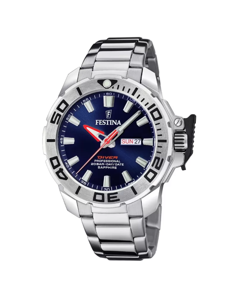 Pánské quartzové hodinky, které mají datumovku s dnem v týdnu. Vodotěsnost je 20 ATM, takže jsou hodinky vhodné pro potápění do hloubky 50 metrů. Hodinky mají safírové sklíčko. Hodinky mají ocelový tah a ocelové pouzdro.