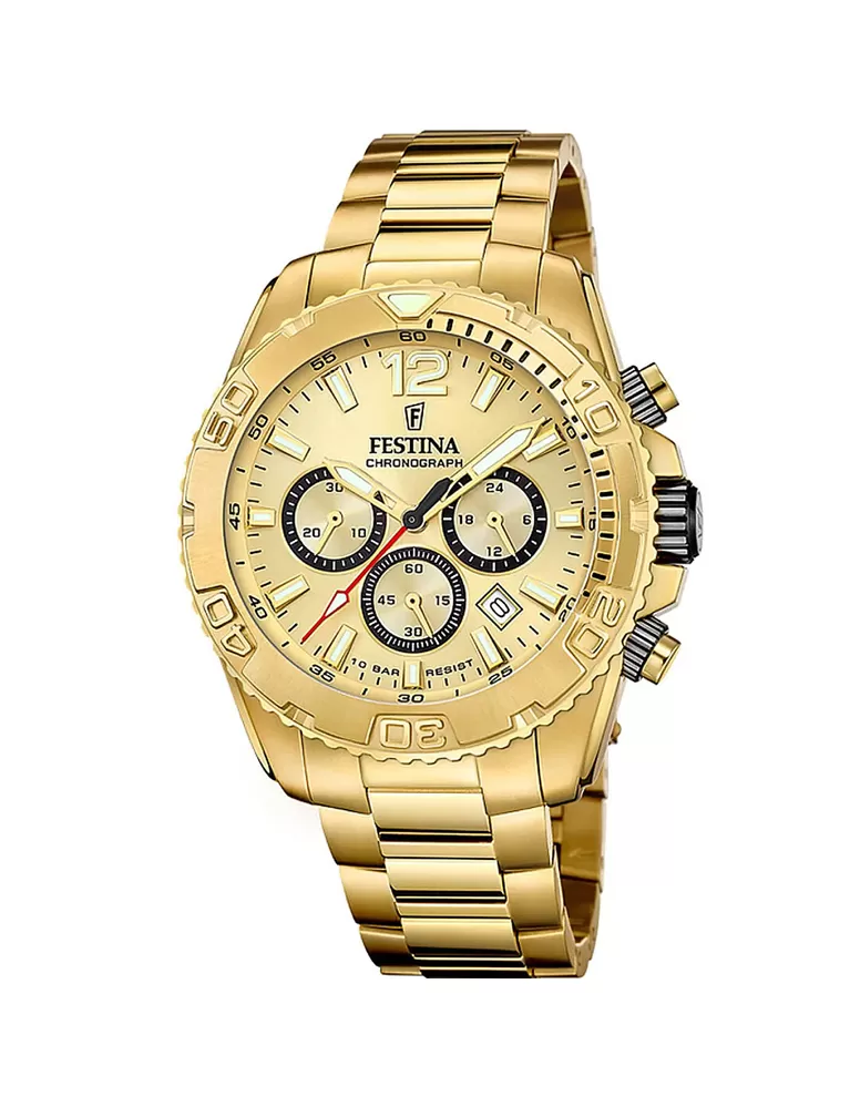 Hodinky Festina 20684/1 z řady Timeless Chronograph skvěle kombinují sportovní a elegantní vzhled. Díky tomuto sladění je možné hodinky využít prakticky při každé příležitosti. Hodinky Festina F20684/1 jsou vyrobeny v celoocelovém zpracování s PVD povrchovou úpravou ve zlaté barvě. Na ciferníku chráněném minerálním sklíčkem se nachází stopky (chronograf), datumovka a subciferník s 24hodinovým čítačem. Uvnitř se pak nachází bateriový (quartzový) strojek, který je oproti mechanickým strojkům přesnější, odolnější vůči mechanickému poškození a ocení jej zejména pohodlnější uživatelé – hodinky totiž nemusíte opakovaně natahovat a nastavovat, ale pouze u nich co rok či dva nechat vyměnit baterii.
