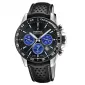 Pánské quartzové hodinky s černým koženým řemínkem jsou vhodné na plavání i šnorchlování díky vodotěnosti 100 metrů. Disponují funkcí stopek, datumovkou a tachymetrickou stupnicí na lunetě.