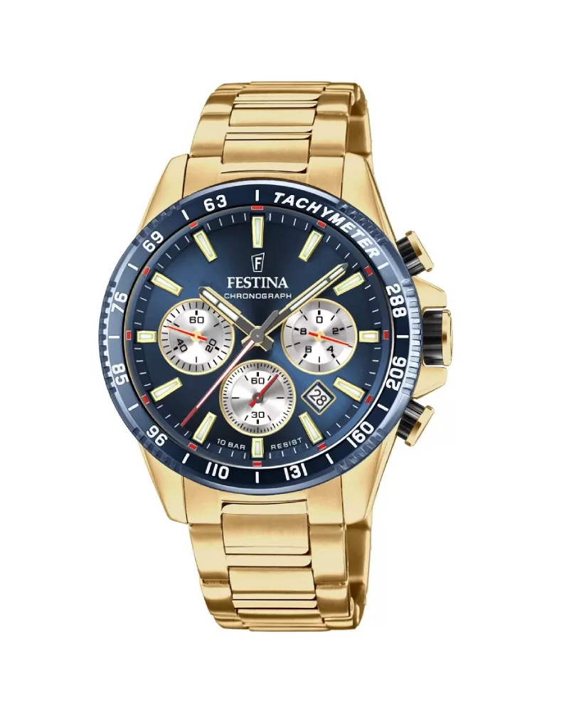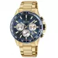 Pánské quartzové hodinky v celo ocelovém provedení, které disponují funkcí stopek, datem, tachymetrickou stupnicí na lunetě a vodotěsností 100 metrů. Tmavě modrý číselník se zlatými indexy je doplněn minerálním sklem.