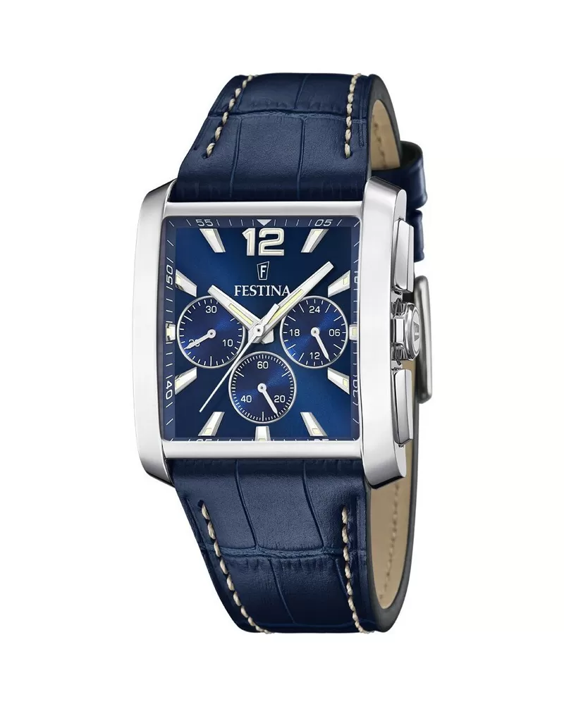 Sportovní kolekce hodinek Festina s chronografy. Hodinky mají netradiční obdélníkové pouzdro chráněné minerálním sklíčkem spolu s koženým řemínkem, který podtrhne elegantní styl hodinek.