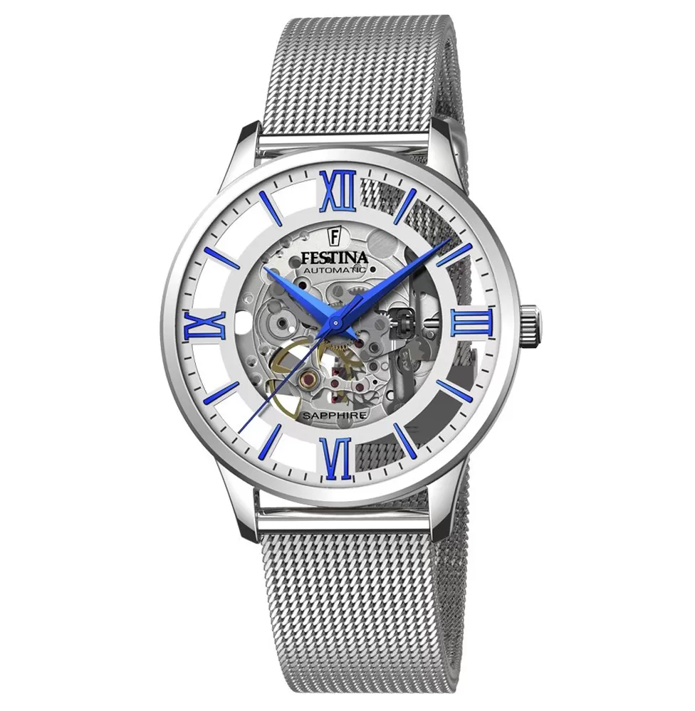 Hledáte spolehlivé hodinky v luxusním designu? Tak to Vás upoutá tento model hodinek Festina. Analogové hodinky Automaty jsou celé vyrobeny z chirurgické ocele s kulatým pouzdrem a úžasným pohledem na pracující strojek, které vidíte přes safírové sklo. Vodotěsnost u tohoto modelu je 50ATM. Tyto hodinky si zamilujete. Jsou dokonalým spojení luxusu a kvality.
