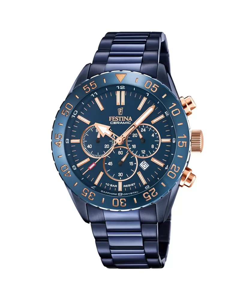 Pánské hodinky s chronografem z kolekce Ceramic. Ocelové pouzdro je technologií PVD zbarveno do modré barvy, osazeno safírovým sklem, keramickou lunetou a doplněno o korunky v barvě růřového zlata. Díky vodotěsnosti 10 Atm se můžete s hodinkami potápět bez obav.