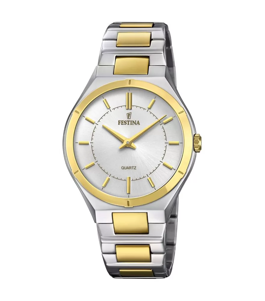 Pánské hodinky značky Festina z kolekce Retro vás zaujmou svým celo-ocelovým provedením s částečnou povrchovou úpravou zlacením žlutým zlatem. Hodinky mají stříbrný ciferník zdobený zlacenými indexy a ručičkami, které ladí s pozlaceným pouzdrem a řemínkem. Ocel, ze které jsou hodinky vyrobené, se pyšní vysokou odolností a dlouhou životností. Vodotěsnost hodinek se označuje jako 50M, což sedí na hloubku 0,5 metrů.