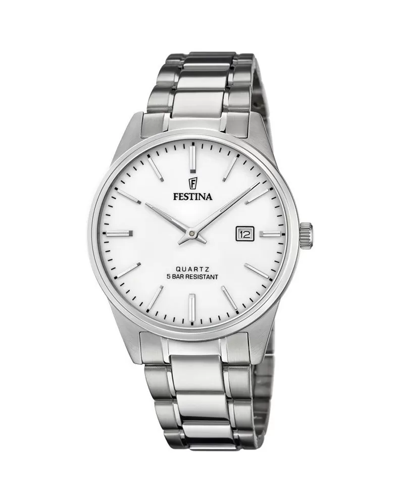 Pro klasika klasické hodinky Festina. Hodinky jsou vyrobené z nerezové oceli v čisté linii. Ciferník obsahuje římské zlaté číslice, které jsou kontrastní s bílým podkladem. Na cifeníku najdete i datum, který je umístěn na pozici tří hodin