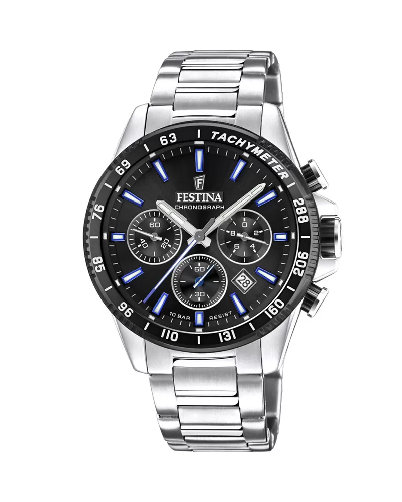 Sportovní model pro muže má pevné kulaté ocelové pouzdro zdobeno pevnou tachymetrickou lunetou. Řemínek hodinek je také vyroben z chirurgické ocele.… Celý popis