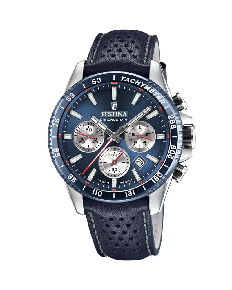 Sportovní model pro muže má pevné kulaté ocelové pouzdro zdobeno pevnou tachymetrickou lunetou. Model je doplněn o kožený řemínek z kvalitní kůže precizně prošívané po stranách. Hodinky disponuje vodotěsností 10 ATM, takže se můžete s hodinkami potápět bez dýchacího přístroje. Ozdobte své zápěstí kvalitními hodinkami a udělejte dojem svým dokonalým vkusem.