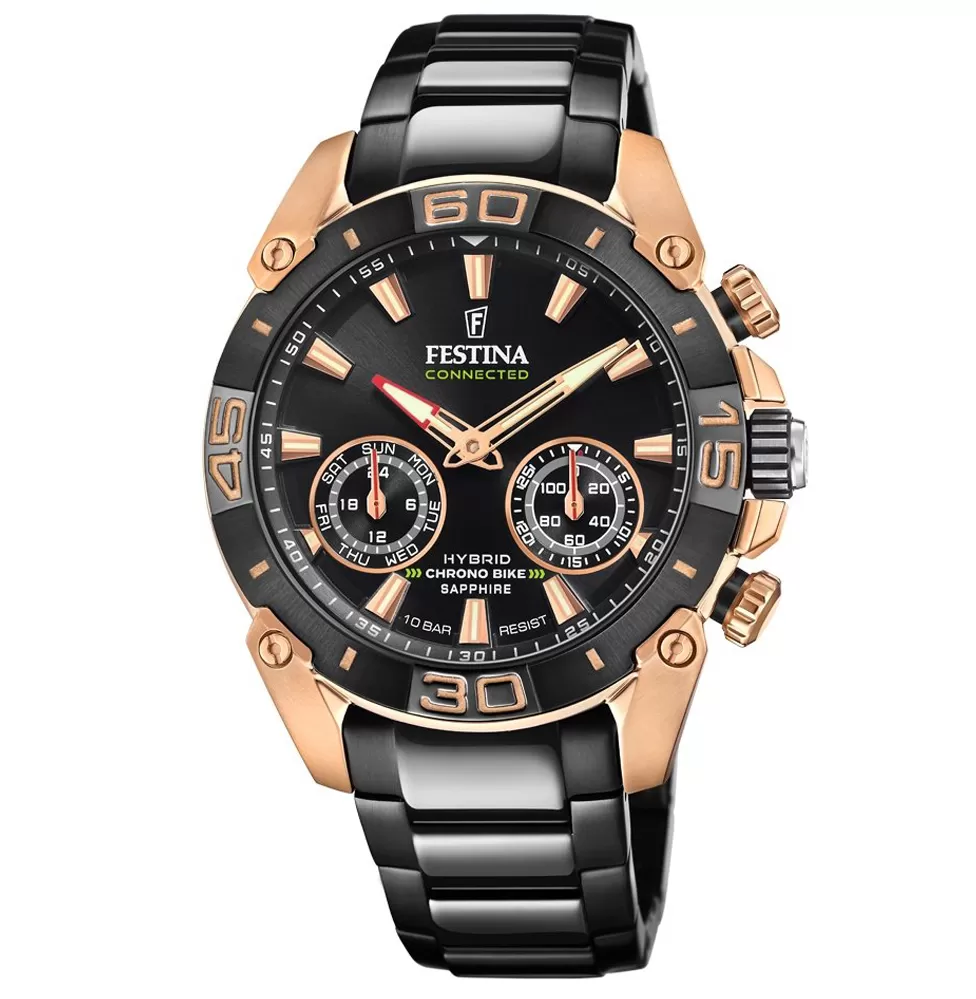 Pánské hodinky FESTINA Speciál kolekce - connected. Na první pohled sportovní pánské analogové chronografy se safírovým sklíčkem a 10 atmosfér vodotěsnosti, ale uvnitř se kromě hodinářské strojku skrývá chytrý modul, který komunikuje přes Bluetooth s vaším telefonem a díky tomu získáte mnoho chytrých funkcí jako krokoměr, inteligentní notifikace, ukládání polohy GPS, budík, datum, stopky, časové zóny, ovládání telefonu a mnoho dalšího.