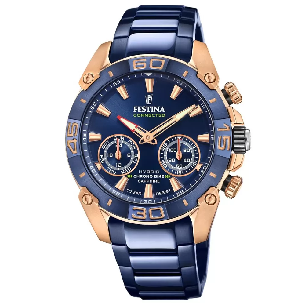 Pánské hodinky FESTINA Speciál kolekce - connected. Na první pohled sportovní pánské analogové chronografy se safírovým sklíčkem a 10 atmosfér vodotěsnosti, ale uvnitř se kromě hodinářské strojku skrývá chytrý modul, který komunikuje přes Bluetooth s vaším telefonem a díky tomu získáte mnoho chytrých funkcí jako krokoměr, inteligentní notifikace, ukládání polohy GPS, budík, datum, stopky, časové zóny, ovládání telefonu a mnoho dalšího.