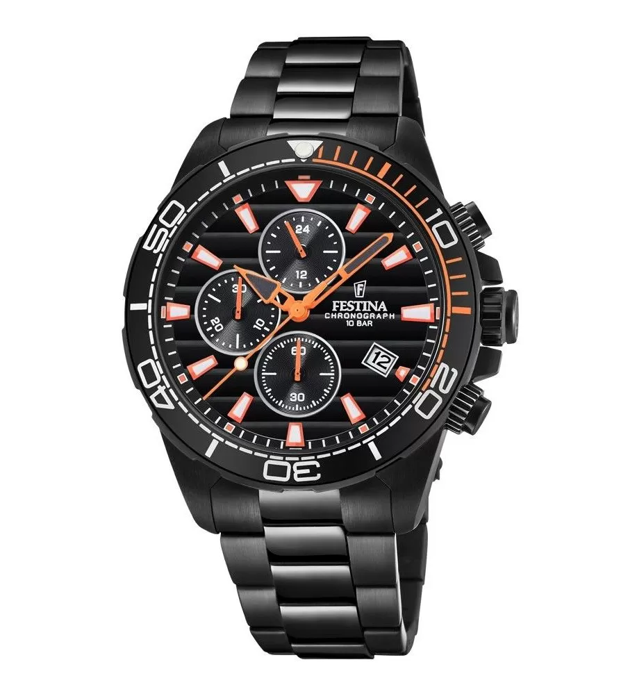 Pánské sportovní hodinky značky Festina v analogovém zobrazení času v luxusním provedení. Hodinky mají pouzdro a řemínek z nerezové oceli, která se pyšní vysokou odolností, dlouhou životností a je oblíbeným materiálem v oboru hodinářství. Hodinky jsou celé povrchově upraveny černou barvou. Elegantní černý ciferník je zdobený oranžovými prvky a disponuje sub-ciferníky s funkcemi stopek a zobrazují 24 hodinový formát času. Dále hodinky disponují luminiscencí indexů a na pozici 4 hodiny mají hodinky umístěnou datumovku. Hodinky jsou pod označením 100M vodotěsné až do hloubky osmi metrů.