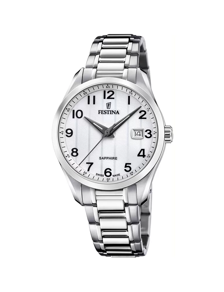 Pánský model Festina F20026 nabídne především vysoce elegantní vzhled, který bude zdárně sekundovat i společenskému obleku, safírové sklíčko vysoce odolné proti poškrábán a voděodolnost 5 ATM, což stačí pro běžné mytí rukou, déšť či rychlou sprchu. Do bazénu si však hodinky sundejte. Decentní reliéfní úprava číselníku dodává hodinkám příjemné ozvláštnění, aniž by narušila společenský status hodinek. V pouzdru z ušlechtilé oceli tiká švýcarský quartzový strojek Ronda 705. Čisté linie hodinek umocňuje také přítomnost pouze hodinové, minutové a vteřinové ručky. Praktickou stránku pak doplňuje ukazatel data i propracovaný ocelový tah s překlápěcím zapínáním.